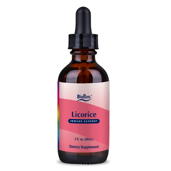 Licorice (Glycyrrhiza glabra) root is an herbal adaptogen that has been used for centuries in Ayurvedic and Traditional Chinese Medicine. It is a versatile, demulcent herb and a complimentary companion to other dietary and botanical supplements. BioPure® Organic Licorice tincture soothes sensitive throat tissue and mucous membrane irritation and supports upper respiratory, immune, and gastrointestinal system function.*