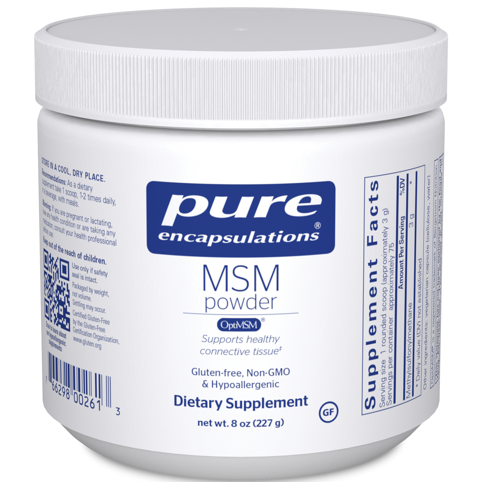 Pure Encapsulations' MSM (methylsulfonylmethane or dimethylsulfone) is a source of organic sulfur found naturally in the human body. MSM, the major metabolite of DMSO (dimethyl sulfoxide), is 34% elemental sulfur, a compound that is crucial in maintaining healthy tissues. While sulfur supports many functions, it is well known for maintaining connective tissue health. Sulfur also supports tissue containing significant amounts of collagen and keratin, including hair, skin, and nails. Sulfur is essential in methionine, cysteine and serum protein metabolism. Preliminary evidence suggests that MSM may also provide potential support for healthy immune and respiratory function.*