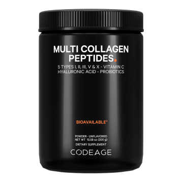 Codeage Multi Collagen Peptides Powder Black Edition offers 5 types of collagen all-in-one and features probiotics, vitamin C, and hyaluronic acid, in a hydrolyzed and unflavored collagen powder nutritional solution for women and men.